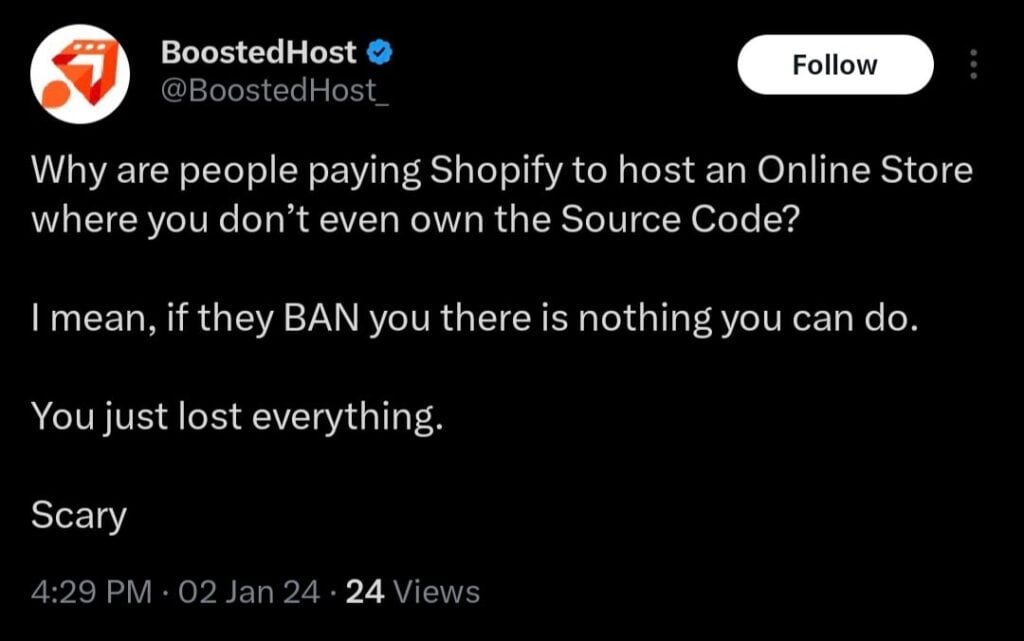 What most people don't realize is that when you open a store with Shopify, THEY own your store. They own your data. You're RENTING your store like a mall tenant rents a store space or kiosk. They can shut you down, block your incoming payments and keep your hard-earned money in an instant whenever they choose to. Trust us, this happens OFTEN.